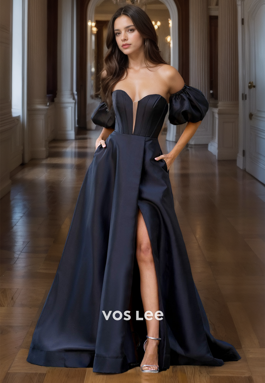 Modest Sweetheart Satin Off-Shoulder Prom Dress Floor Length Elegant A-Line Party Dress