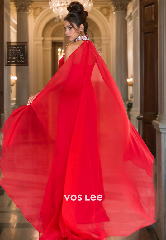Elegant Red Chiffon High Neck Prom Gown Beads Strapless High Slit Party Dress