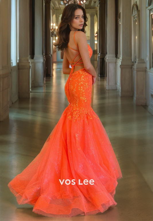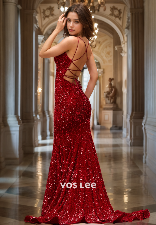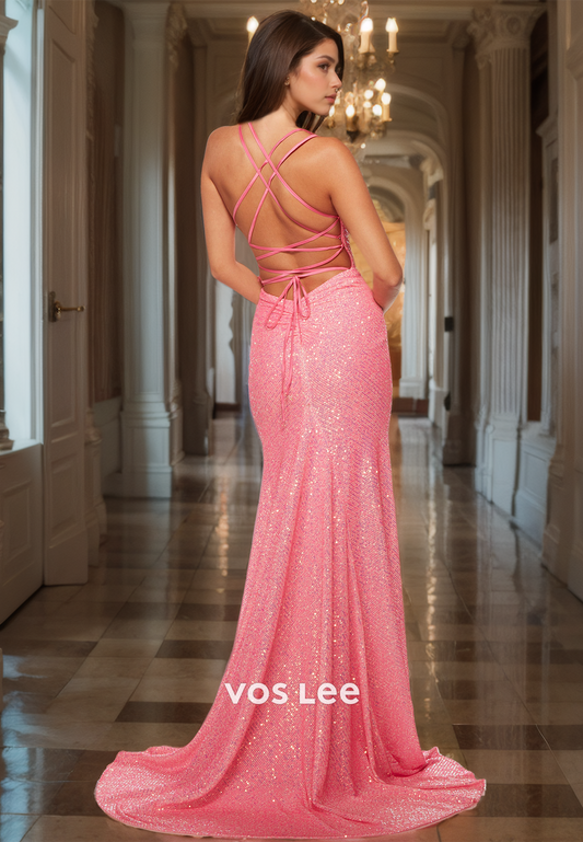 Sparkly V Neck Lace Up Sequined Prom Dress Floor Length Mermaid Quinceanera Dresses