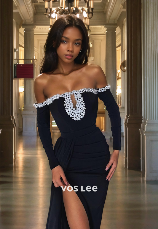 Luxury Pearls Black Floor Length Prom Gown High Slit Formal Evening Party Dress with Long Sleeves