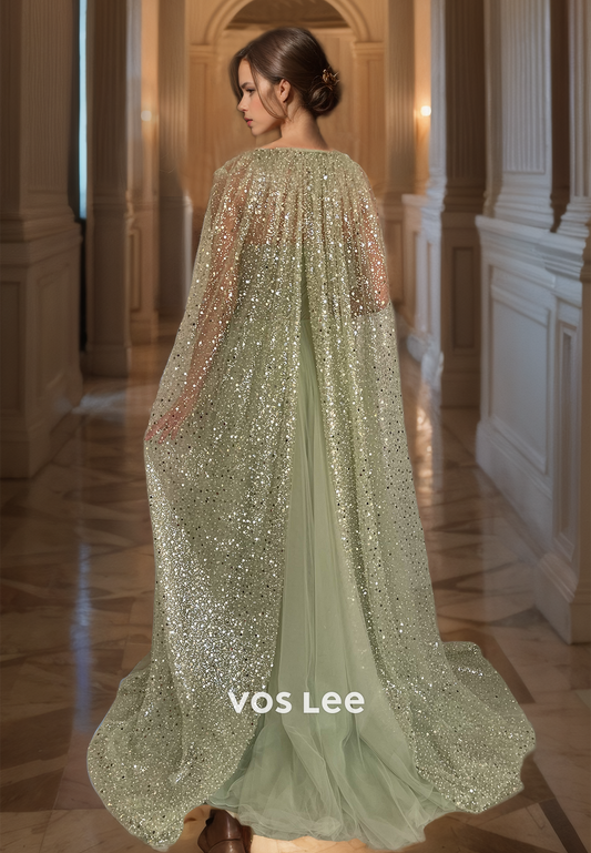 Sparkly Short Sleeves Green Cocktail Dress Lace Up Floor Length Sequins Prom Dresses with High Slit