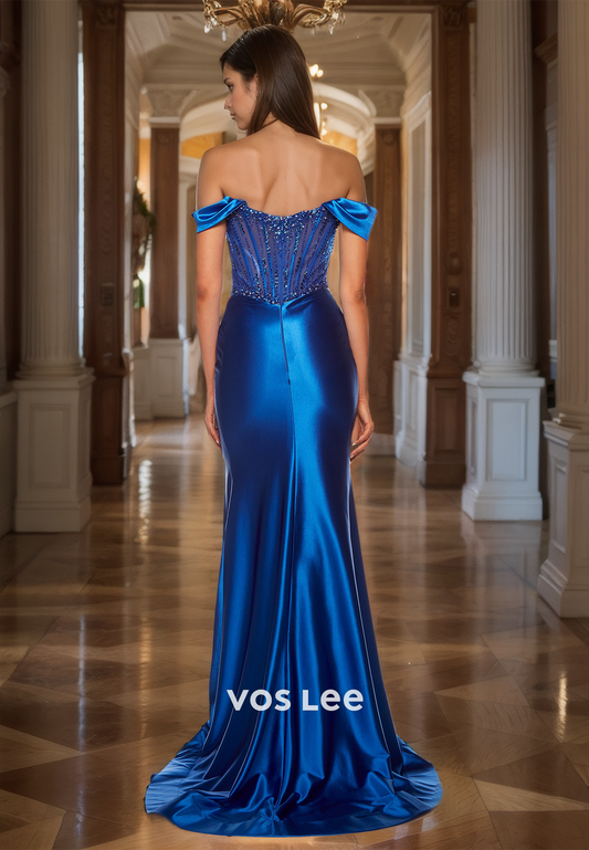 Mermaid Scoop Satin Royal Blue Party Dress Off-Shoulder Floor Length Satin Beads Prom Gown