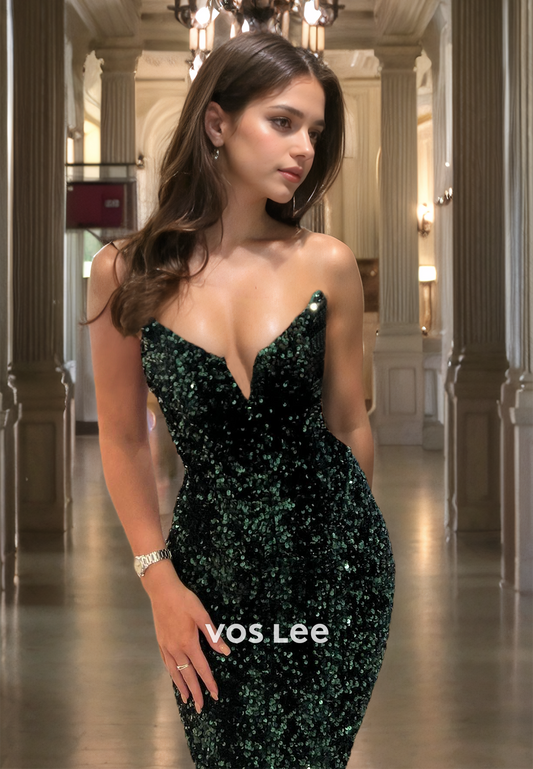 Mermaid V Neck Sparkly Sequined Prom Dresses Floor Length Strapless Dark Green Evening Party Gown
