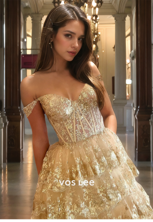 Champagne A-Line Tiered Lace Prom Gown Off-Shoulder Sweetheart Floor Length Party Dresses