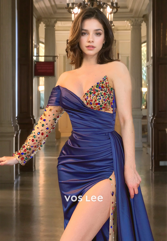 Royal Blue Chiffon Floor Length Formal Party Dresses One Shoulder Beads Prom Gown with High Slit