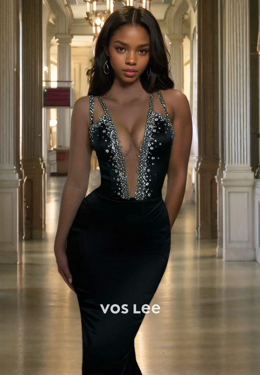 Sexy Deep V Neck Black Prom Dress Spaghetti Straps Satin Beads Pageant Dress Floor Length