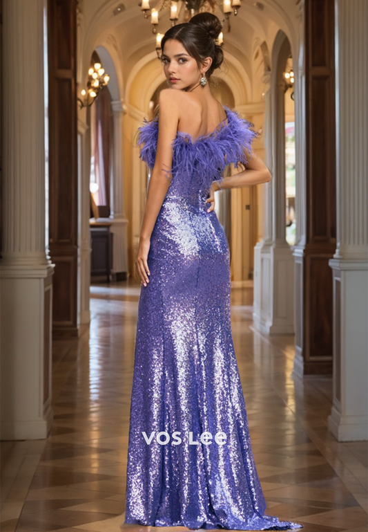 Graceful Mermaid Sequins Purple Prom Dress Strapless Feathers Floor Length Cocktail Party Gown
