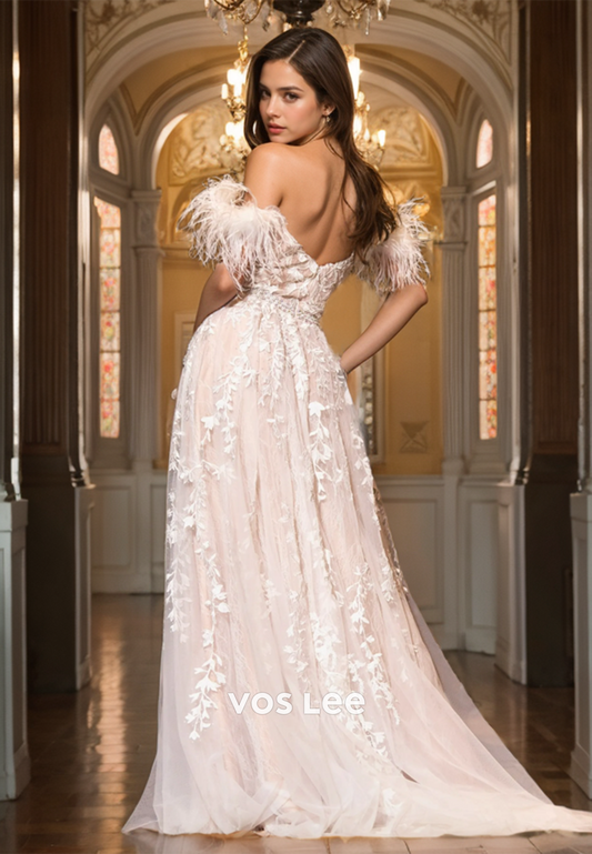 Black Mermaid Feather Off-Shoulder Prom Dress Lace Floor Length Charming Cocktail Dress with High Slit