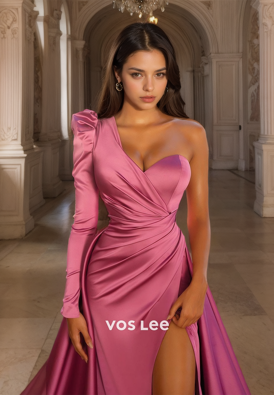 Flamingo Long One Sleeve Satin Prom Dress Pleated A-Line Elegant Pageant Dress with Slit