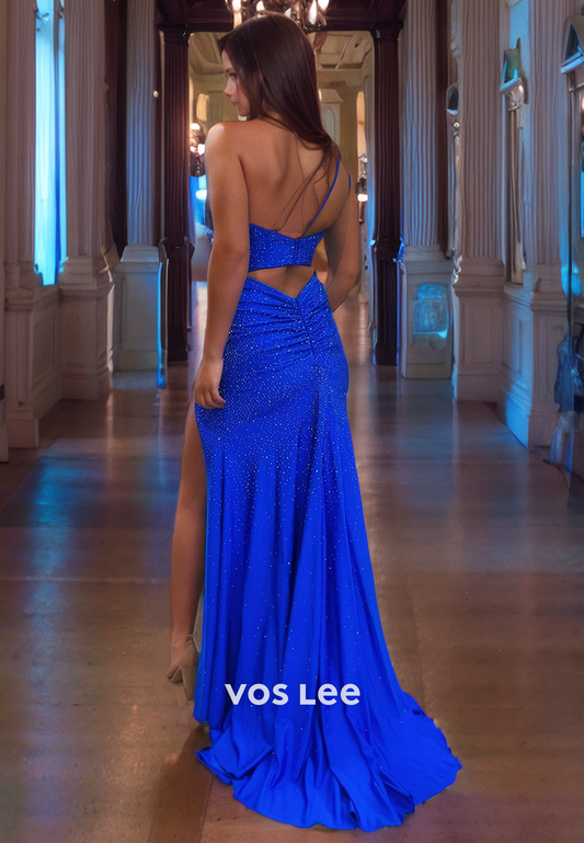 Sparkly Royal Blue One Shoulder Prom Dress Appliqued Sequins Mermaid Pageant Dresses with Slit
