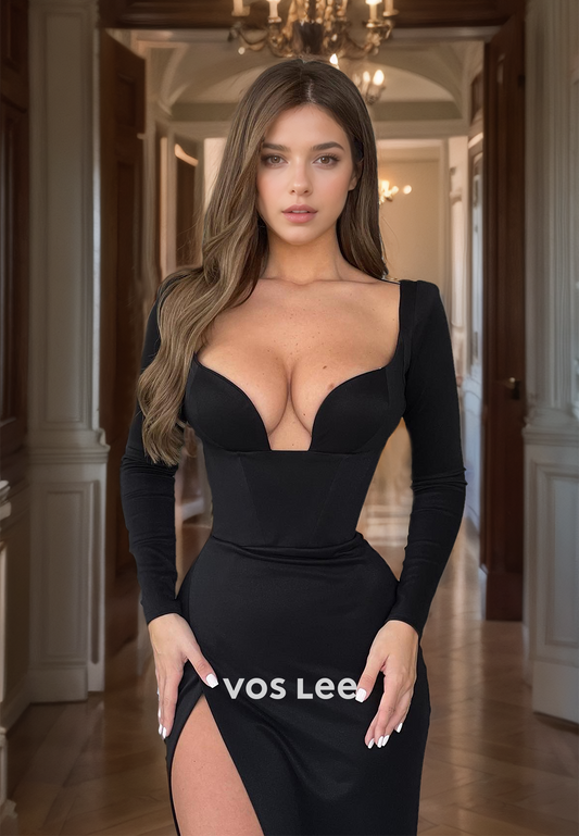 Elegant Sweetheart Full Sleeves Black Long Dresses Floor Length Night Party Dress with High Slit