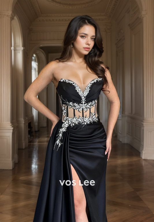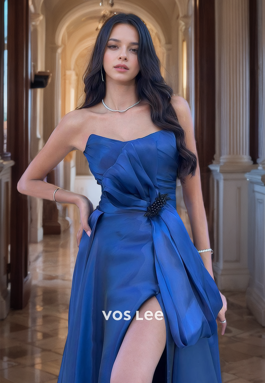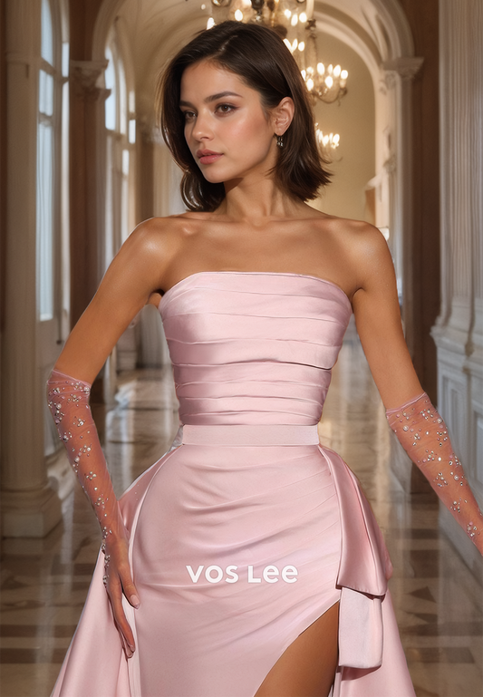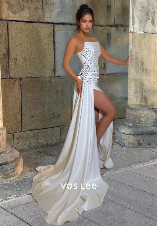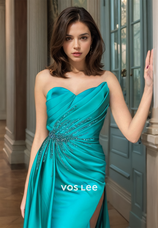 Elegant Satin Strapless Floor Length Prom Dress Pearls Pleated Party Dresses with High Split