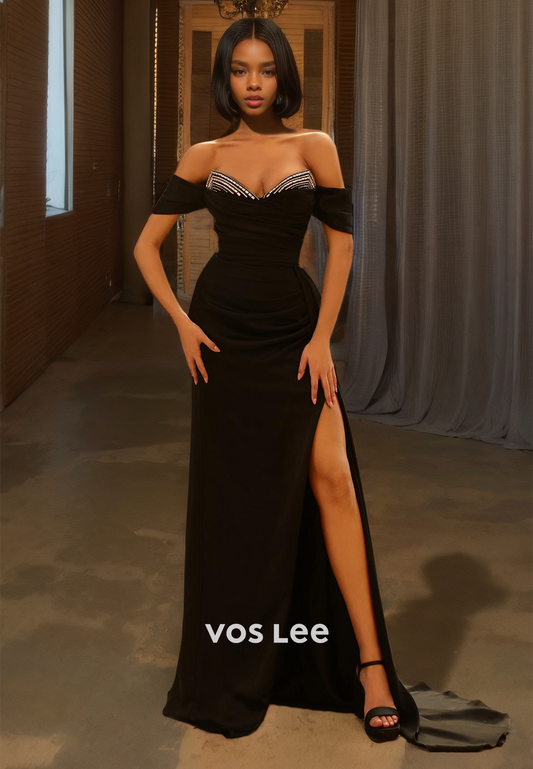 Elegant Black Sweetheart Formal Cocktail Dress Off-Shoulder Floor Length Party Dress with High Slit