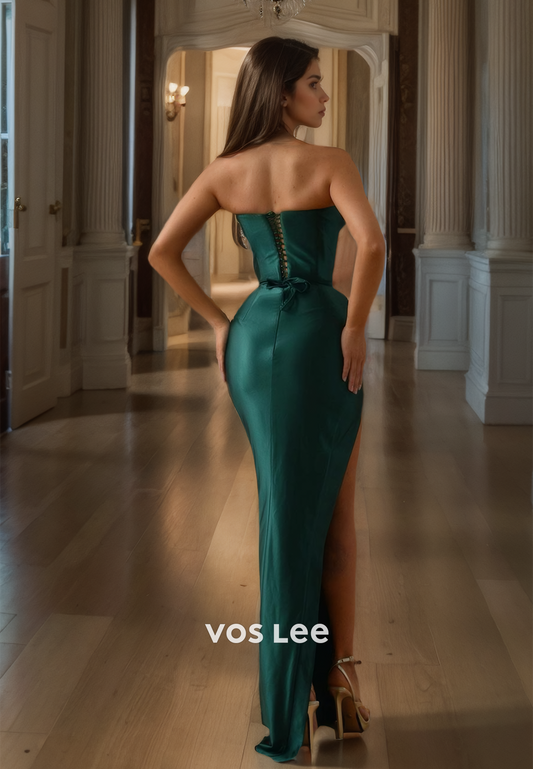 Graceful Dark Green Strapless Prom Dress Zipper Back Satin Pleated Evening Party Dresses with Slit