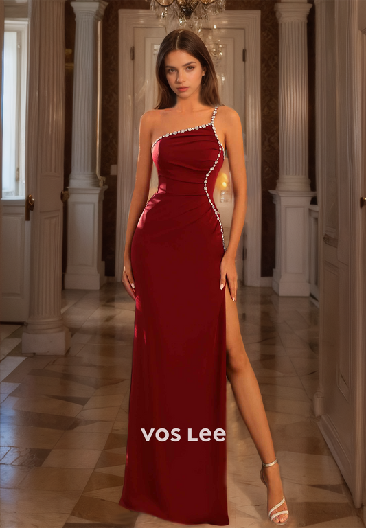 Elegant Side Slit Night Party Dress One Shoulder Beads Floor Length Prom Dress
