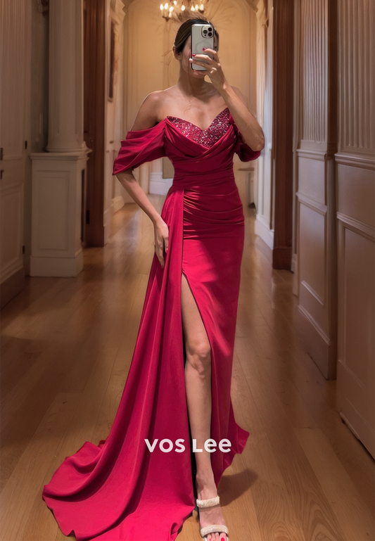 A-Line Satin Off-Shoulder Pleated Prom Dresses Royal Blue High Slit Formal Occasion Dress