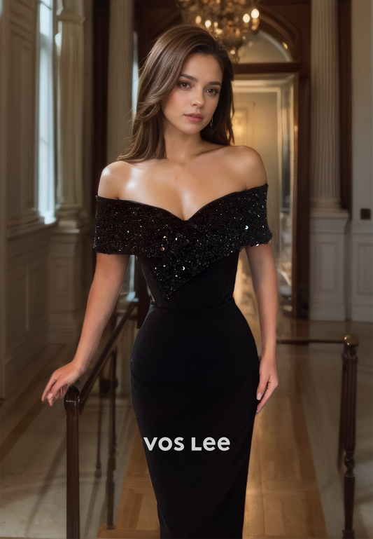 Graceful Black Off-Shoulder Sequins Prom Dress Floor Length Sweetheart Zipper Back Evening Party Dress