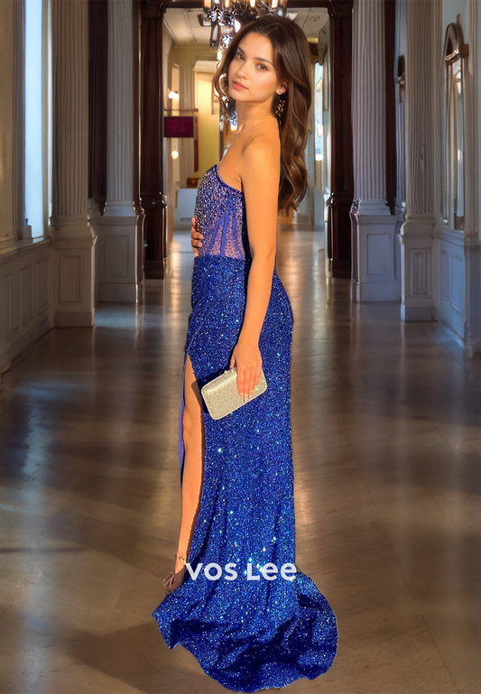 Sparkly Royal Blue Strapless Mermaid Prom Dress Corset Back Sequins Formal Evening Prom Dresses