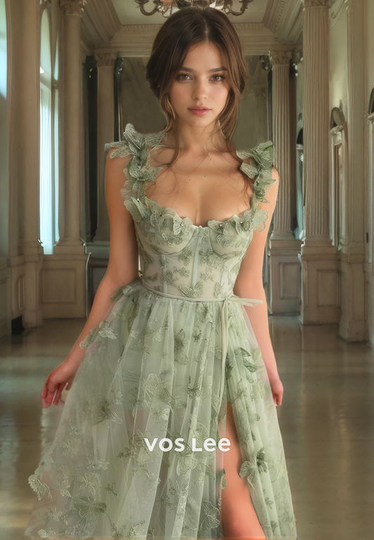 Graceful Satin Eucalyptus Spaghetti Straps Cocktail Dress Sweetheart Side Split Pageant Long Dresses