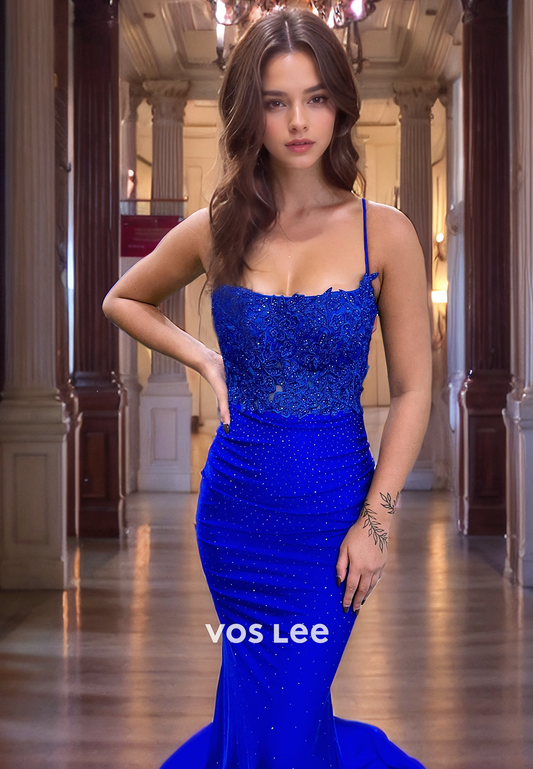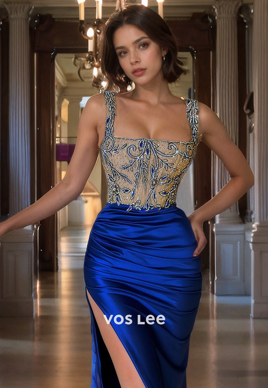 Mermaid Beads Royal Blue Evening Party Dress Straps Backless Satin Long Dresses