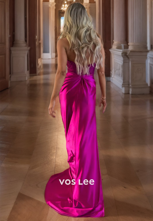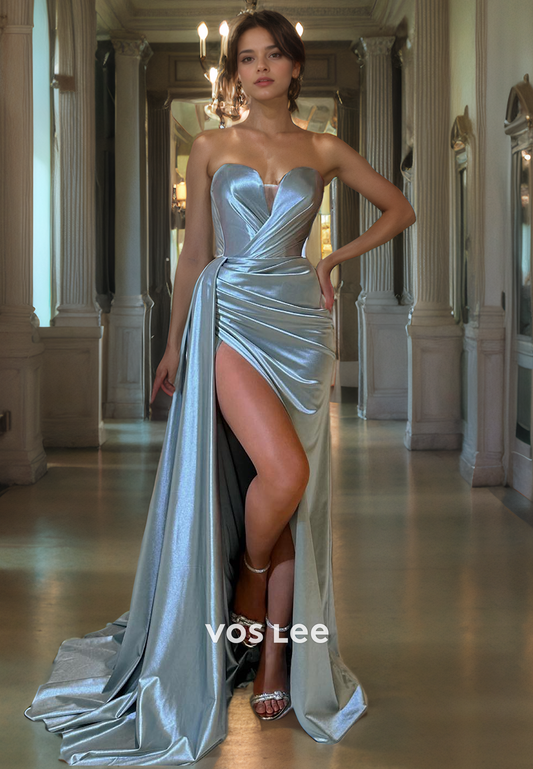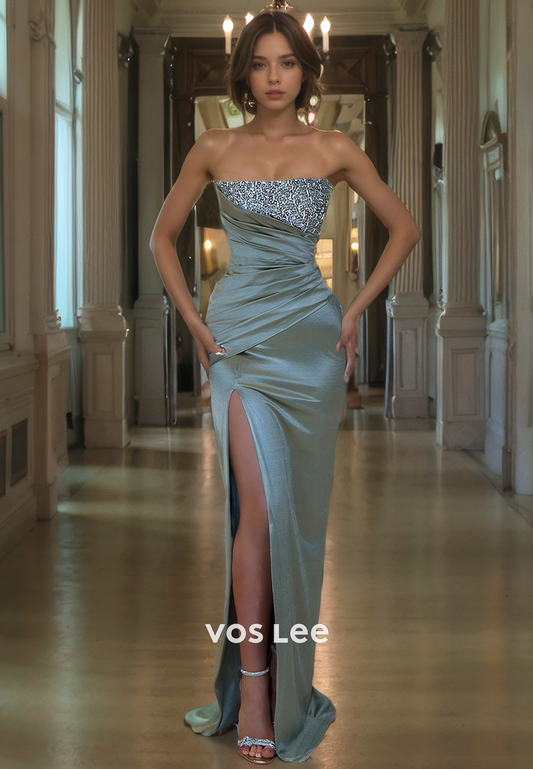 Elegant Pleated Strapless Satin Prom Dress Sleeveless Floor Length Side Slit Formal Dresses