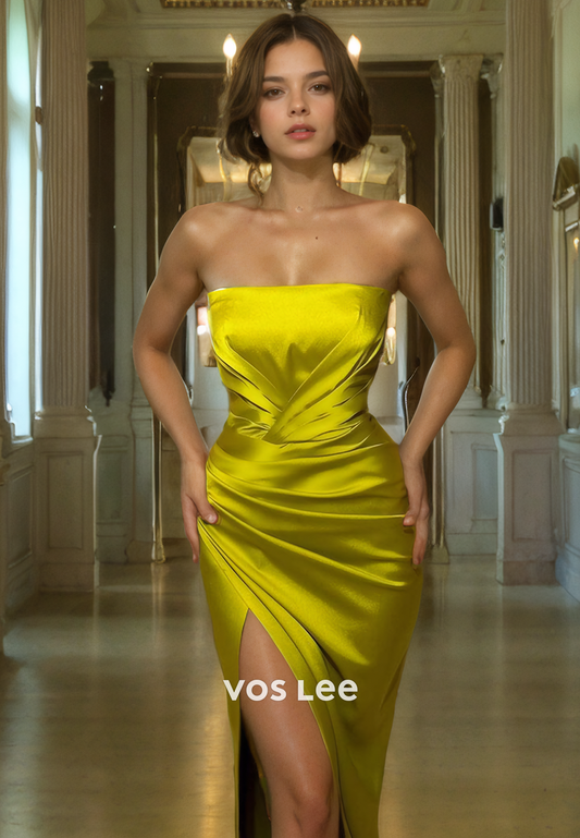 Elegant Satin Yellow Side Split Pageant Dresses Strapless Pleated Evening Party Dress