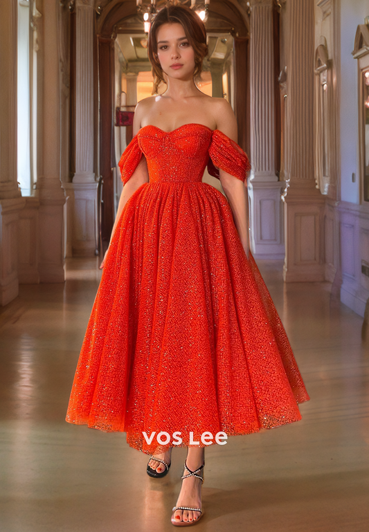 Sparkly Red A-Line Off-Shoulder Quinceanera Dress Sweetheart Ankle Length Glitter Prom Dress