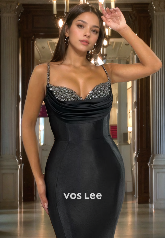 Graceful Spaghetti Straps Beads Prom Dress Black Mermaid Floor Length Evening Prom Gown