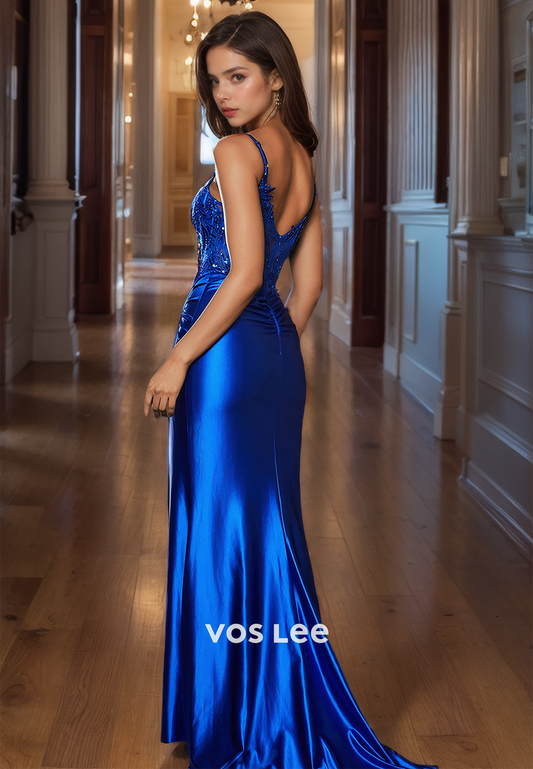 Elegant Appliqued Royal Blue Club Night Party Dress Straps Satin Formal Prom Dress with High Slit