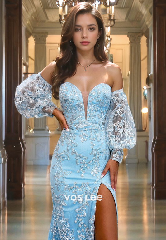 Sweetheart Puffy Sleeves Lace Prom Dress Elegant Mermaid Club Night Party Dress with Slit