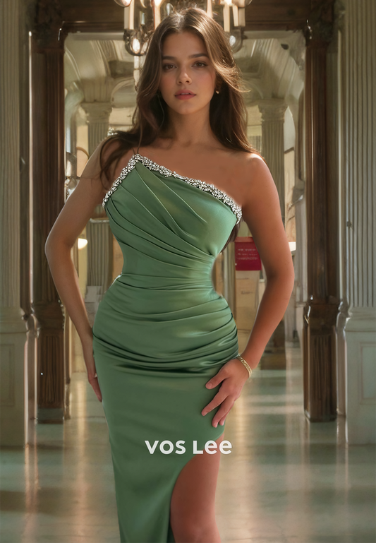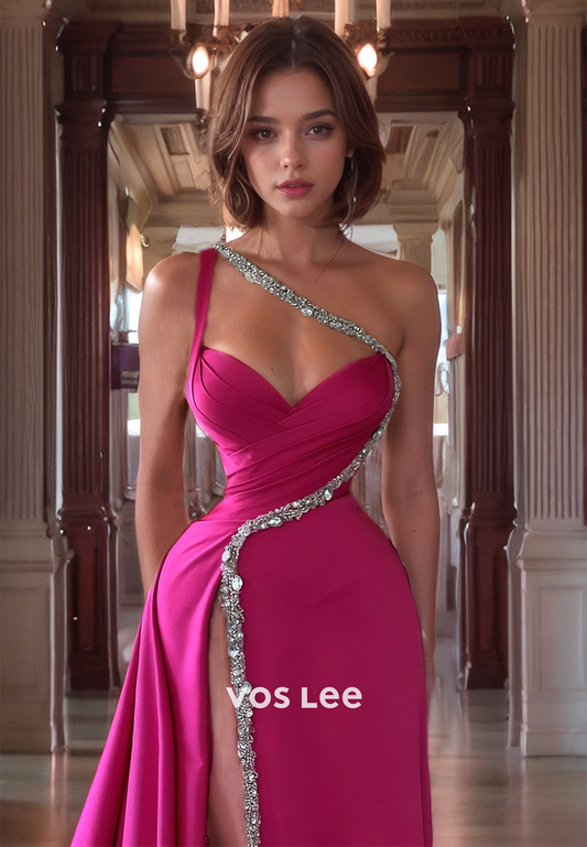 Sheath/Column One Shoulder Cutout Satin Prom Dress with High Slit and Rhinestone Sashes