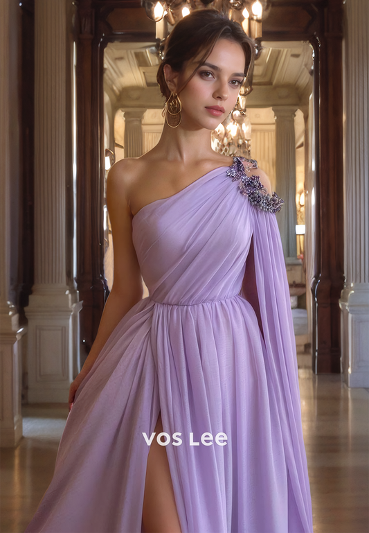 A-Line One Shoulder High Slit Prom Dress with Rhinestone Straps