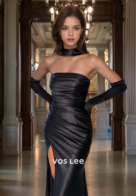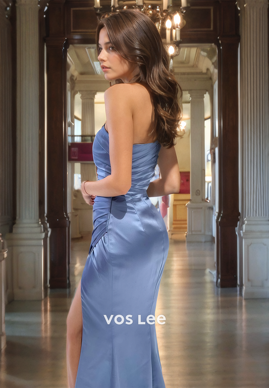 Trumpet/Mermaid Strapless Pleated Satin Prom Dress with High Slit