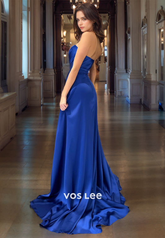 A-Line Sweetheart Strapless Court Train Ruched Satin Prom Dress with High Slit