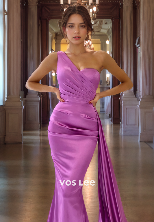 Trumpet/Mermaid One Shoulder Sweep Train Pleated Satin Prom Dress with High Slit