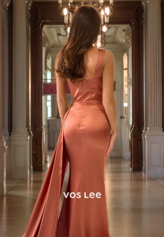 Trumpet/Mermaid Square Straps Satin Prom Dress with High Slit