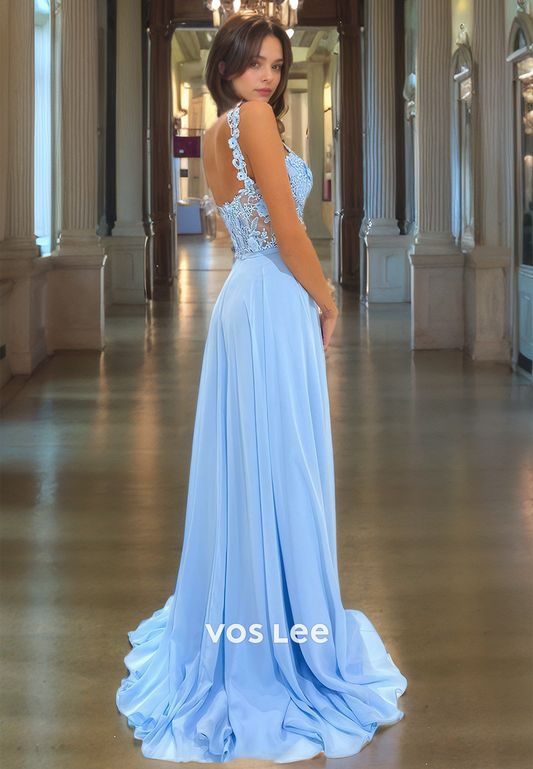 A-Line V-Neck Floor-Length Prom Dress with High Slit and Appliques