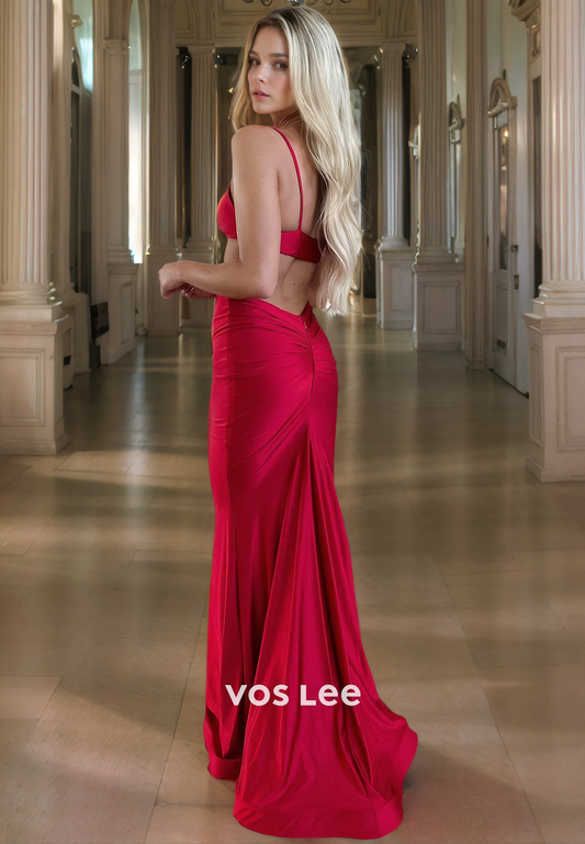 Sheath/Column Sweetheart Spaghetti Straps Ruched Prom Formal Dress with High Slit