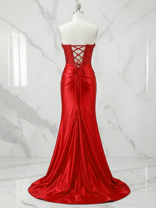 Glamorous Red Strapless Beaded Corset Satin Prom Dress with Slit