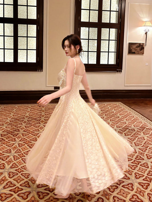 Ivory A line Spaghetti Straps Long Prom Dresses Wedding Guest Dress