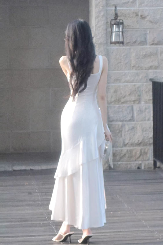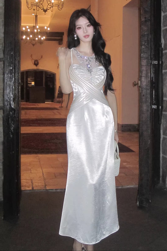 Sweety Square Neck White Satin Party Evening Night Dresses For Women