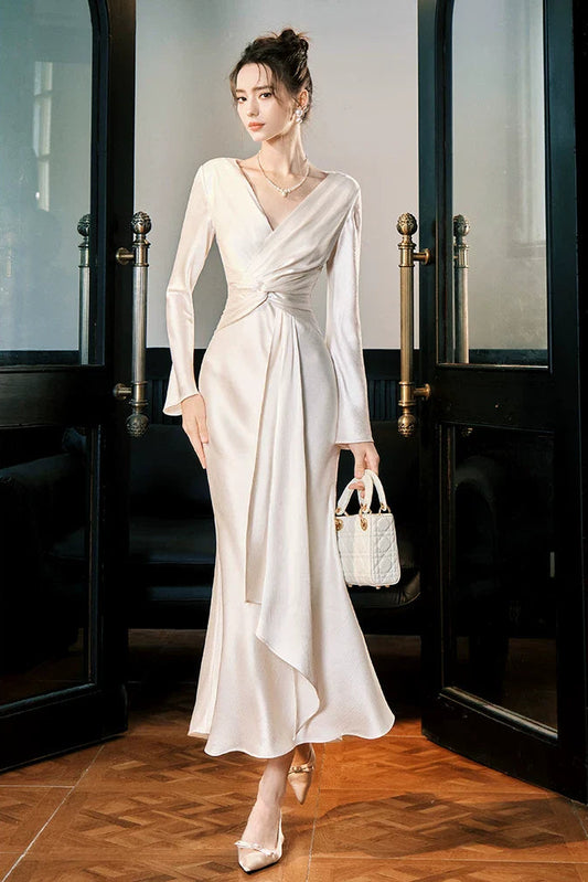 V Neck Long Sleeves Ankle Length Prom Dresses