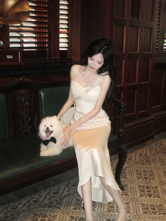 One Shoulderd Classy Mermai White With Beaded Satin Ankle Length Pleated Prom Dress
