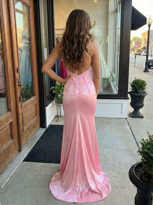 Elegant Pink Satin Mermaid Spaghetti Strap Bodycon Pleated Prom Dress