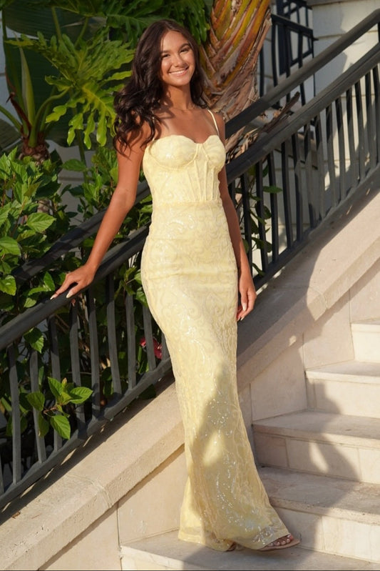 Elegant Straps Yellow Sequin Appliques Fitted Long Dress