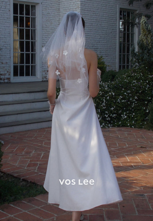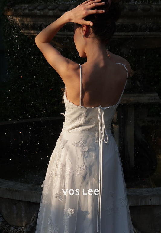 White 3D Butterfly Appliqué Midi Wedding Dress | Spaghetti Strap Bridal Gown