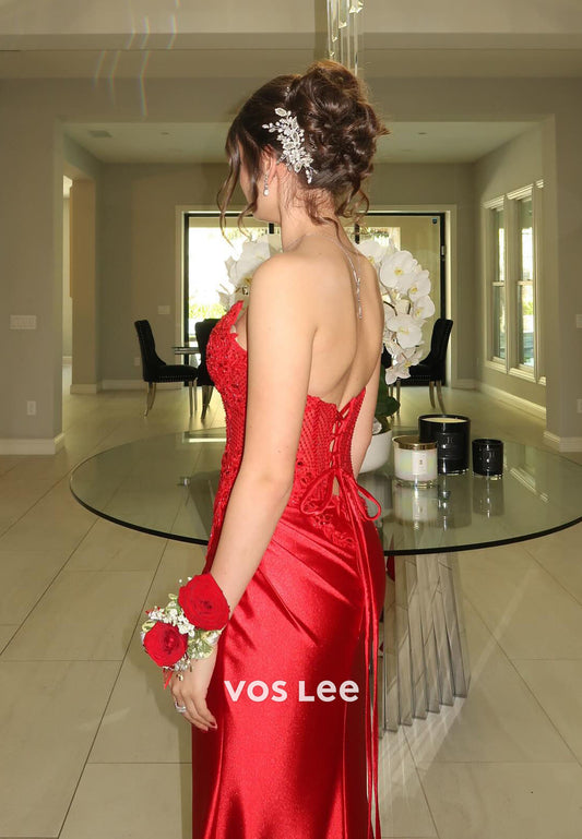 Stunning Red Satin Mermaid Prom Dress with Corset Bodice | 2026 Formal Gown