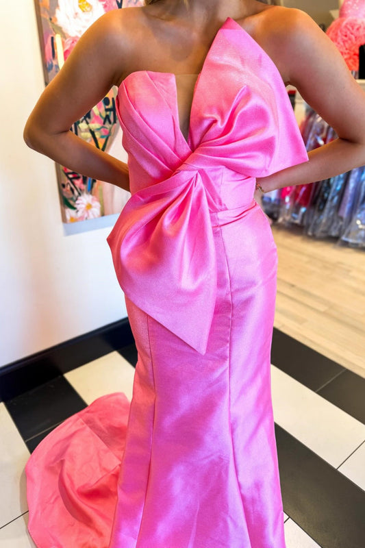 Strapless Hot Pink Bow Mermaid Long Formal Dress