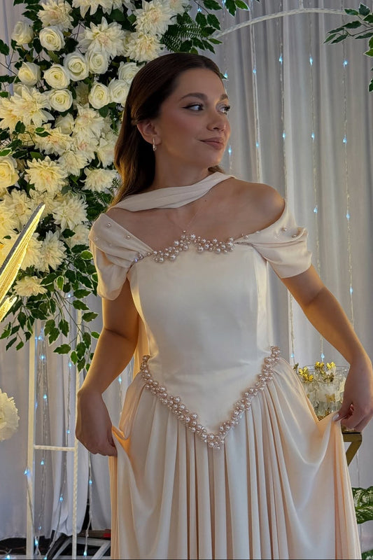 Charming Off-The-Shoulder A-Line Chiffon Prom Dresses Sleeveless Pleats With Pearl