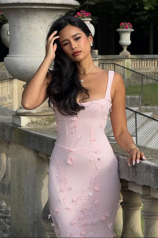 Elegant Pink Square Straps Mermaid Prom Dresses Sleeveless With Flower Beads